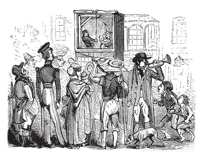 冲床和朱迪是一个传统的流行英语木偶表演的特点 复古线画或雕刻插图插画 正版商用图片0sghb6 摄图新视界